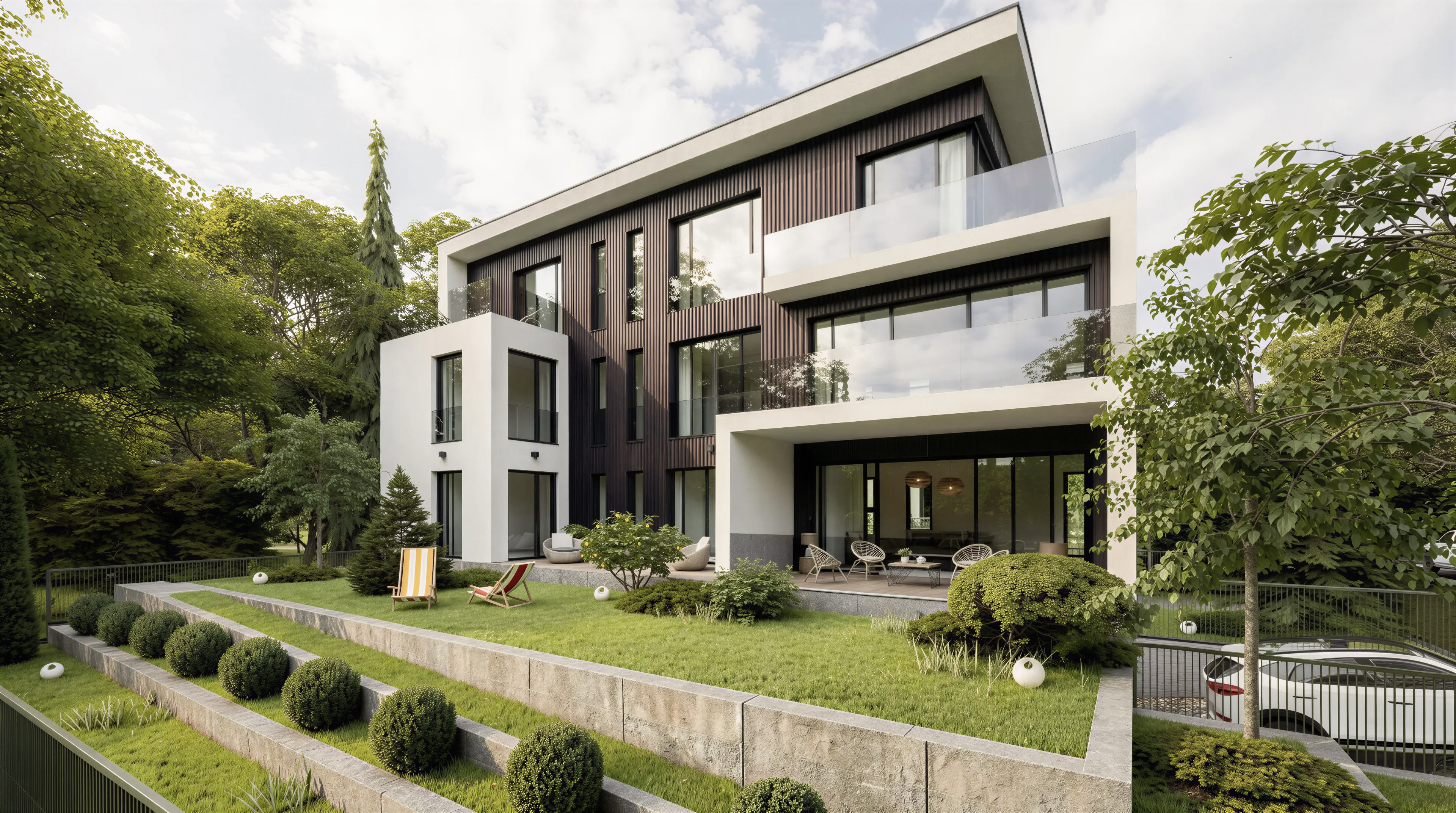 Smešten na jednoj od najprestižnijih lokacija u Beogradu, ovaj projekat predstavlja savršen spoj privatnosti, prirode i čiste moderne arhitekture. Sa svega tri stambene jedinice, gde svaka od prodica zauzima po jedan ceo sprat, ovaj objekat garantuje visok nivo rezidencijalnog komfora, dok je parkiranje obezbeđeno prostranom garažom, diskretno smeštenom u suterenu objekta. Ulaz u objekat je zajednički, a svaki od stanova ima nekoliko sopstvenih terasa, dok je stanarima u prizemlju namenjen i trem koji spaja unutrašnjost objekta sa zelenim pojasem oko kuće.