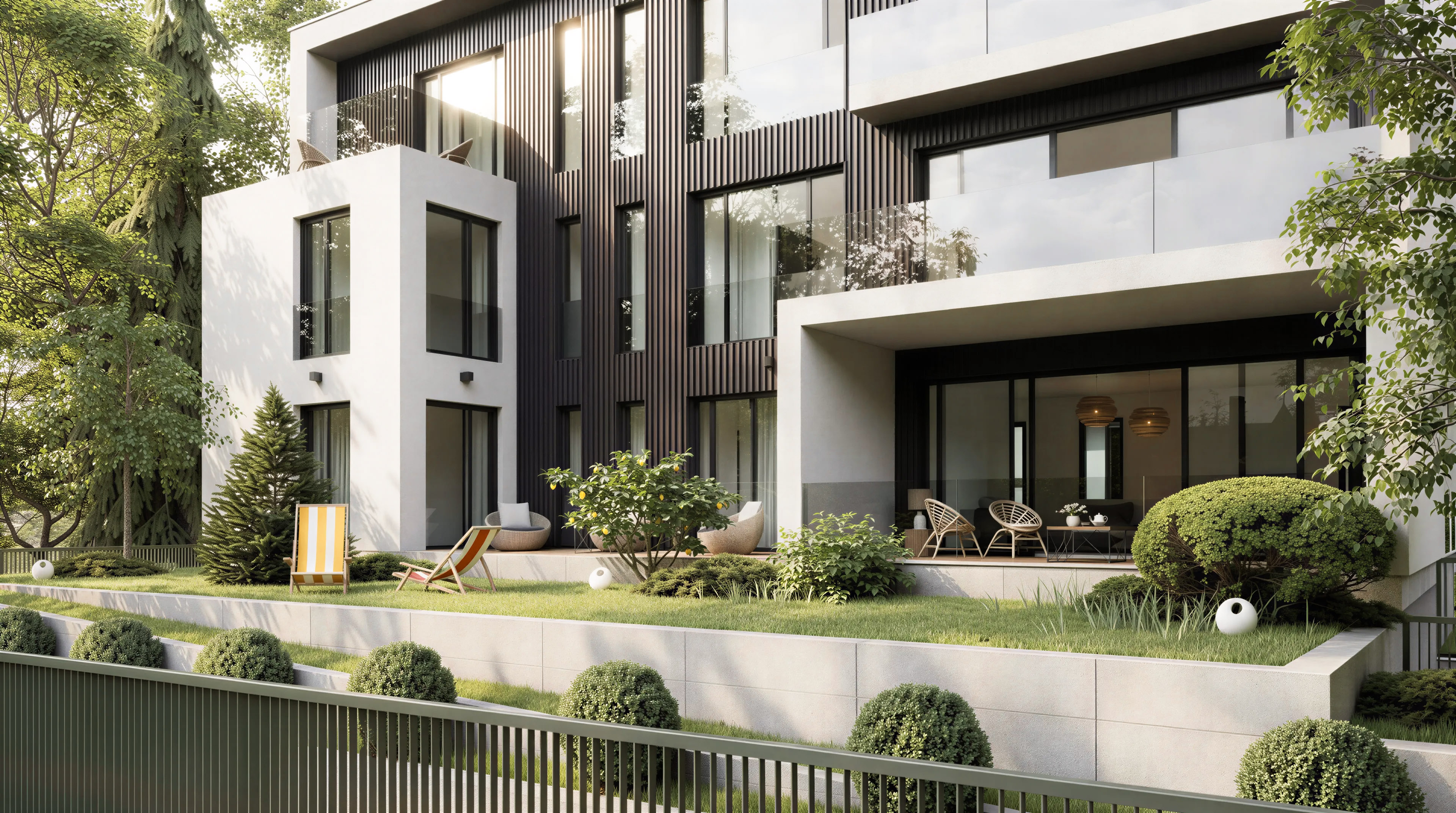 Vizuelni identitet zgrade karakteriše prefinjena igra materijala i volumena koji odražavaju savremen karakter izgradnje. Dominantni Twix paneli u bogatim braon tonovima, postavljeni na podkonstrukciju, daju fasadi teksturalnu dubinu i toplinu, dok čiste bele površine demit fasade uokviruju stambene prostore i naglašavaju moderne linije objekta. Dvorište se kaskadno izdiže iznad nivoa ulice, čime se pokreće okolni teren i stvaraju autentični i prirodni mikroambijenti, čiji je miran karakter usklađen sa prirodom same lokacije. Glavna ulična fasada je pretežno zatvorena radi očuvanja maksimalne privatnosti, pa se objekat otvara ka okruženju sa svojih bočnih strana, čime su obezbeđene dobro osvetljene i provetrene prostorije.