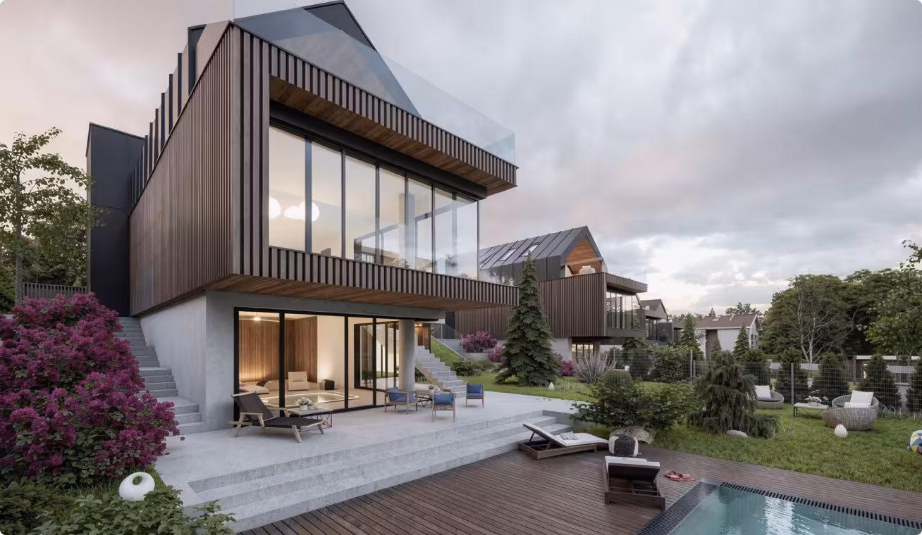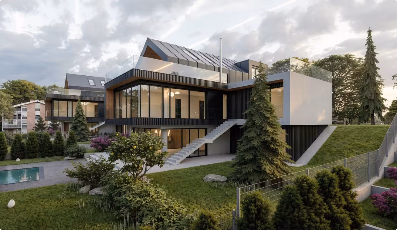 Arhitektonski koncept zasnovan je na dekompoziciji masa kroz tri dominantna kubusa.Suterenska i prizemna etaža formirane su kao dva pravougaona volumena, dok spratna etažasvojim kosim krovom daje objektima prepoznatljivu siluetu. Ovakvo oblikovanje omogućiloje formiranje prostranih terasa na svim nivoima, koje služe kao prirodni produžetak unutrašnjeg prostora. Poseban akcenat stavljen je na transparentnost prizemlja, gde staklene površine od poda do plafona vizuelno integrišu dnevni boravak sa natkrivenom terasom i dvorištem.
