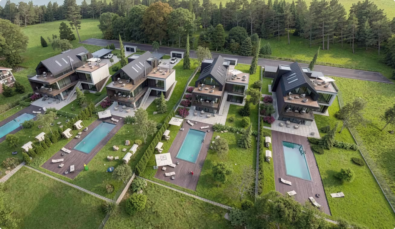 Projektovani kompleks koncipiran je kao grupacija četiri identične luksuzne slobodnostojeće vile, primarno namenjene odmoru i povremenom stanovanju visokog standarda. Pozicioniran na prostranoj parceli u Irigu, projekat maksimalno koristi konfiguraciju terena u padu, a orijentišući se ka unutrašnjim dvorištima, osigurava i potpunu privatnost u odnosu na susedne posede. Arhitektonska postavka prati logiku terena,formirajući duboke vizure ka unutrašnjosti parcele i pratećim rekreativnim sadržajima.