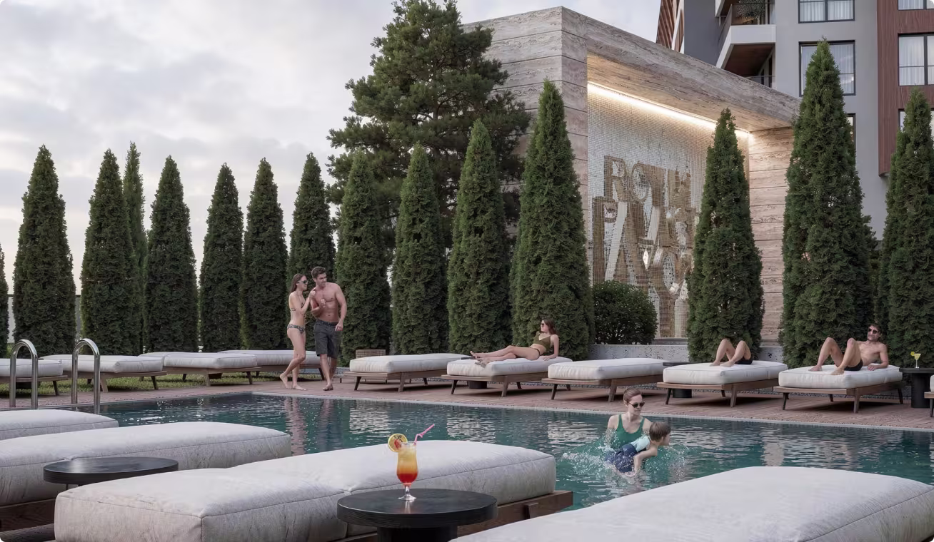Objekat je osmišljen kao integrisana celina koja nudi sve sadržaje potrebne za udoban boravak i poslovanje na jednom mestu. U nižim etažama predviđeno je 47 poslovnih prostora namenjenih prestižnim brendovima, dok centralni deo kompleksa zauzima monumentalni spa i wellness centar. Ovaj prostor za opuštanje dopunjen je luksuznim hotelskim sadržajima poput restorana sa prostranom terasom, konferencijske dvorane,kuglane i dečijih igraonica, čime se stvara ambijent koji nudi sve elemente potrebne za odmor, zabavu i poslovanje na jednom mestu. Ukupno 444 apartmana pažljivo su gradirana po strukturama sa površinama od 55 do 157 m², pružajući korisnicima komfor i privatnost uz punu hotelsku uslugu.