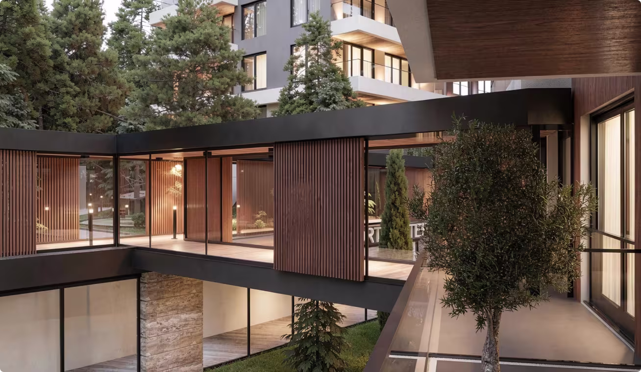 Arhitektonski identitet objekta definišu materijali vrhunskog kvaliteta koji garantuju estetiku i energetsku efikasnost. Predviđena je upotreba visokokvalitetnih aluminijumskih profila sa troslojnim staklima velikih formata, dok fasadna obrada i unutrašnji prostori kombinuju prirodne teksture drveta i granitne keramike. Poseban doživljaj pružaju panoramski liftovi i prostrane terase, koji korisnicima omogućavaju neprestan vizuelni kontakt sa zlatiborskim pejzažom.